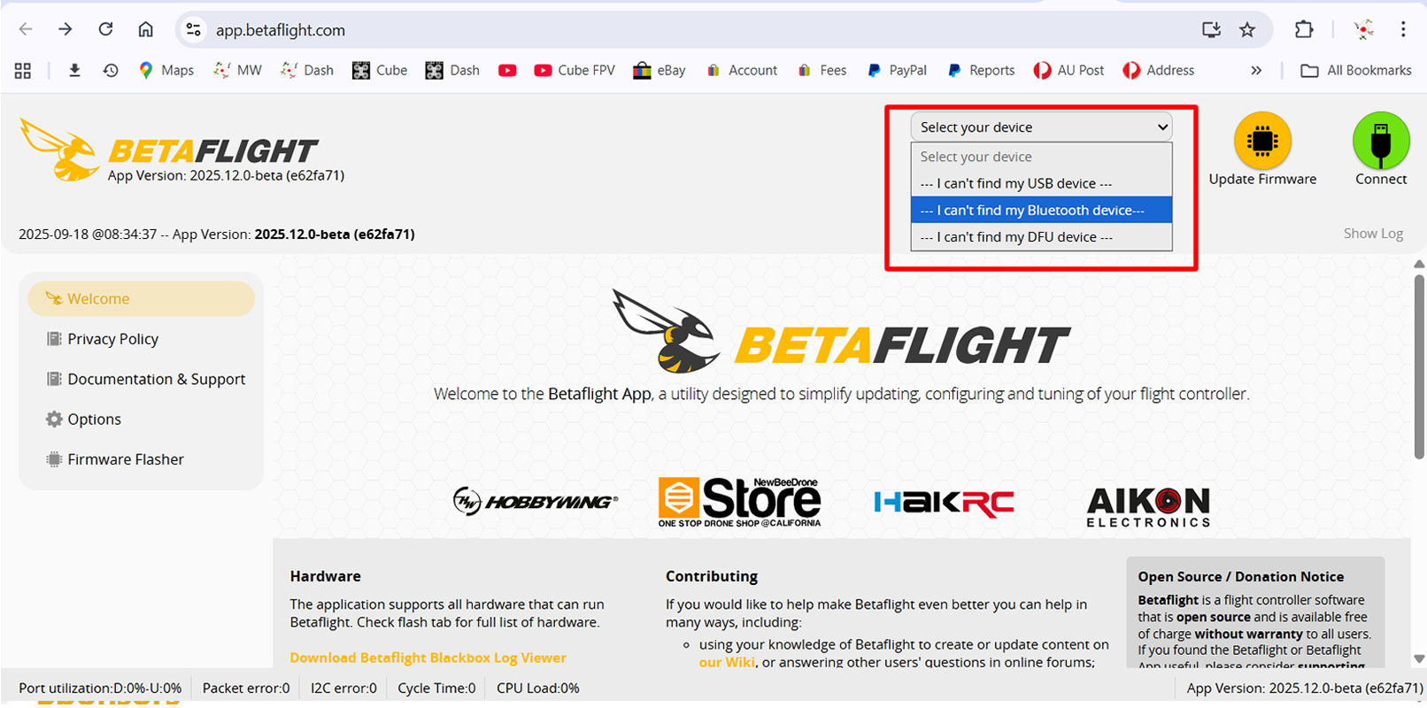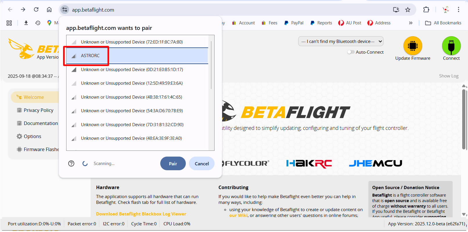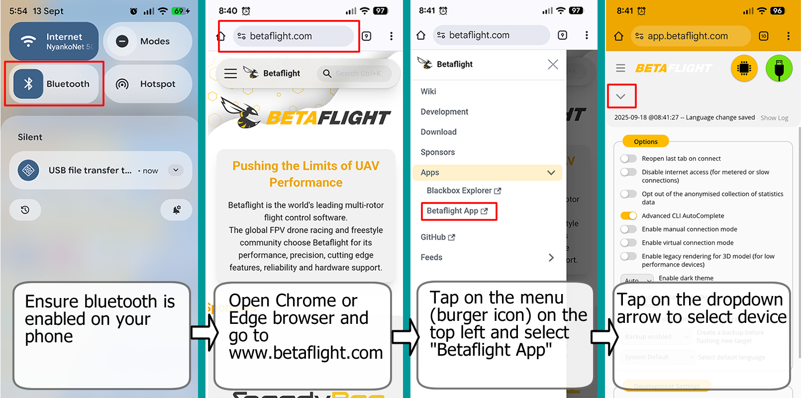 With the drone powered on and the switch in the “On” position, you can then connect through the Betaflight App on computer of phone.