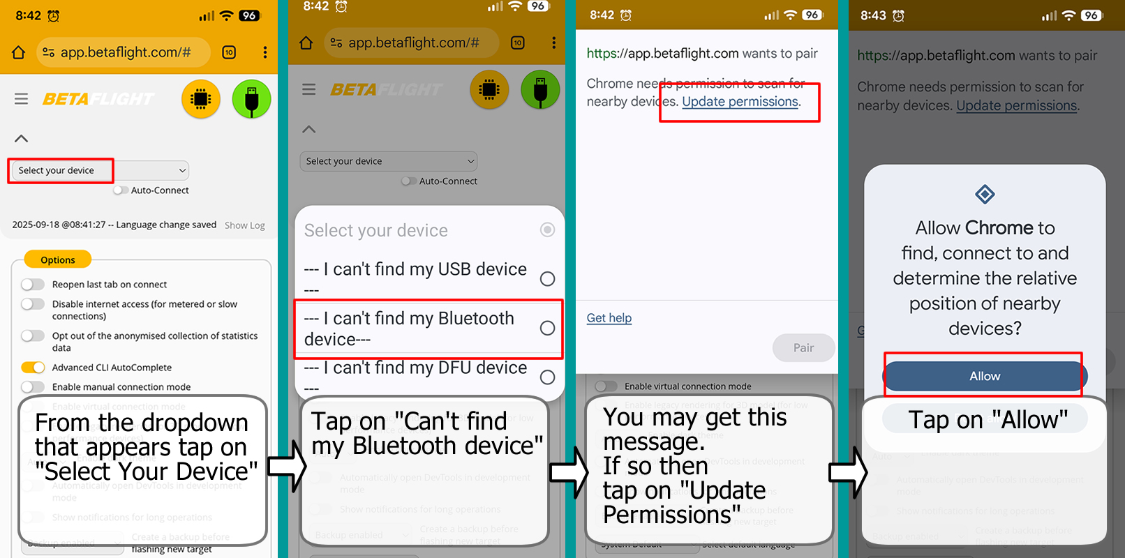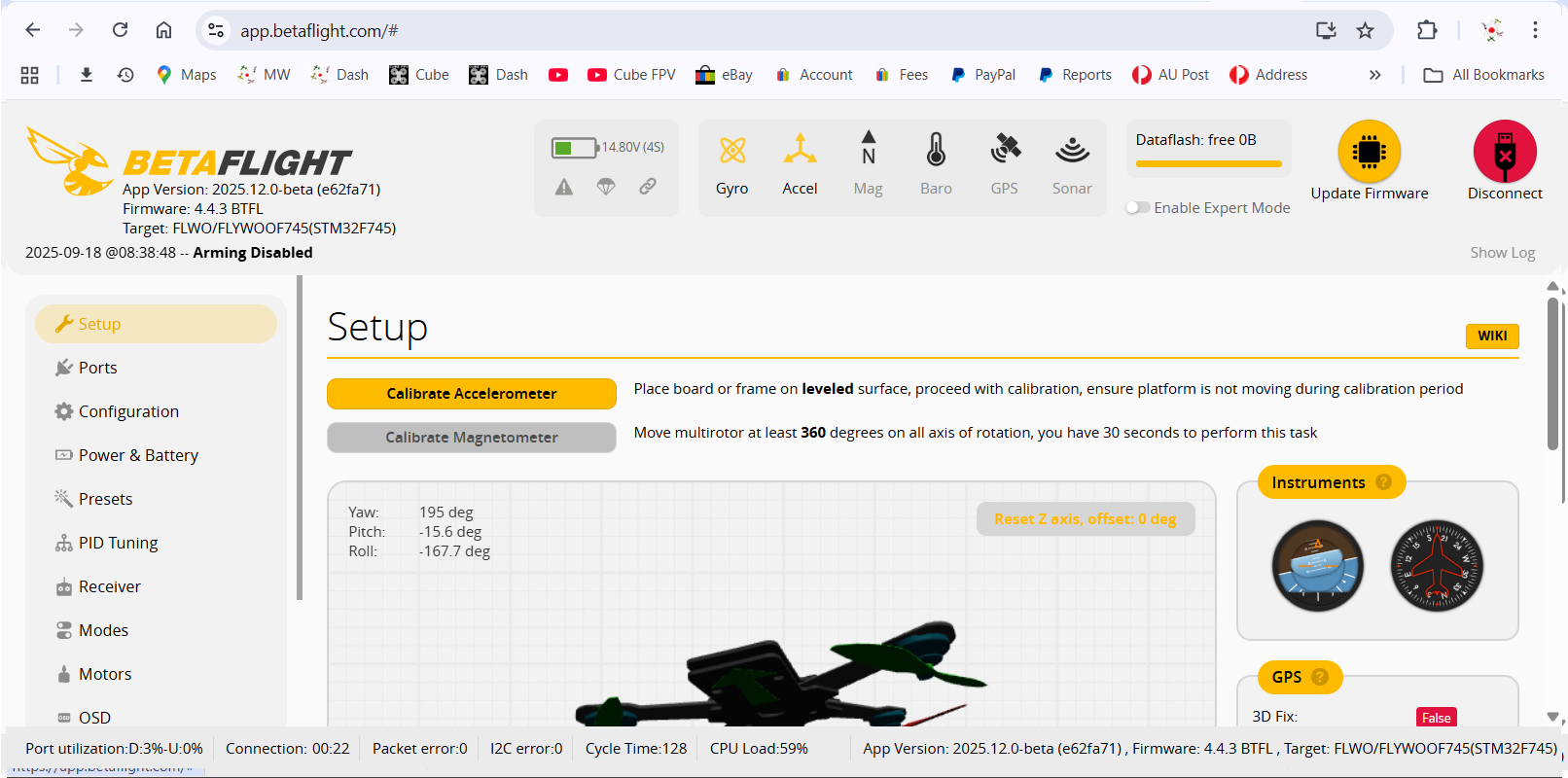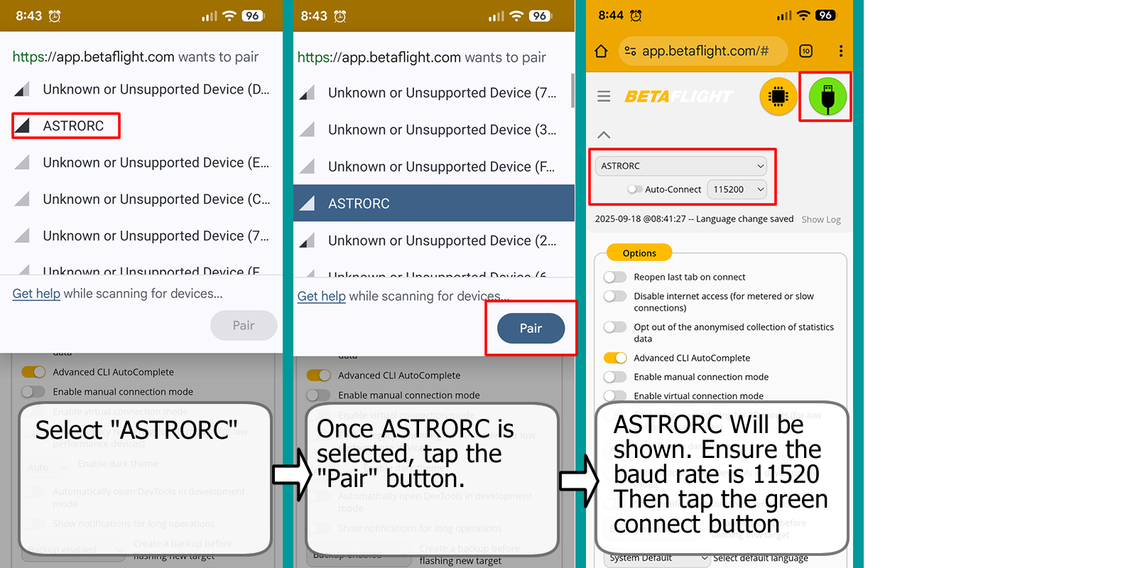 With the drone powered on and the switch in the “On” position, you can then connect through the Betaflight App on computer of phone.