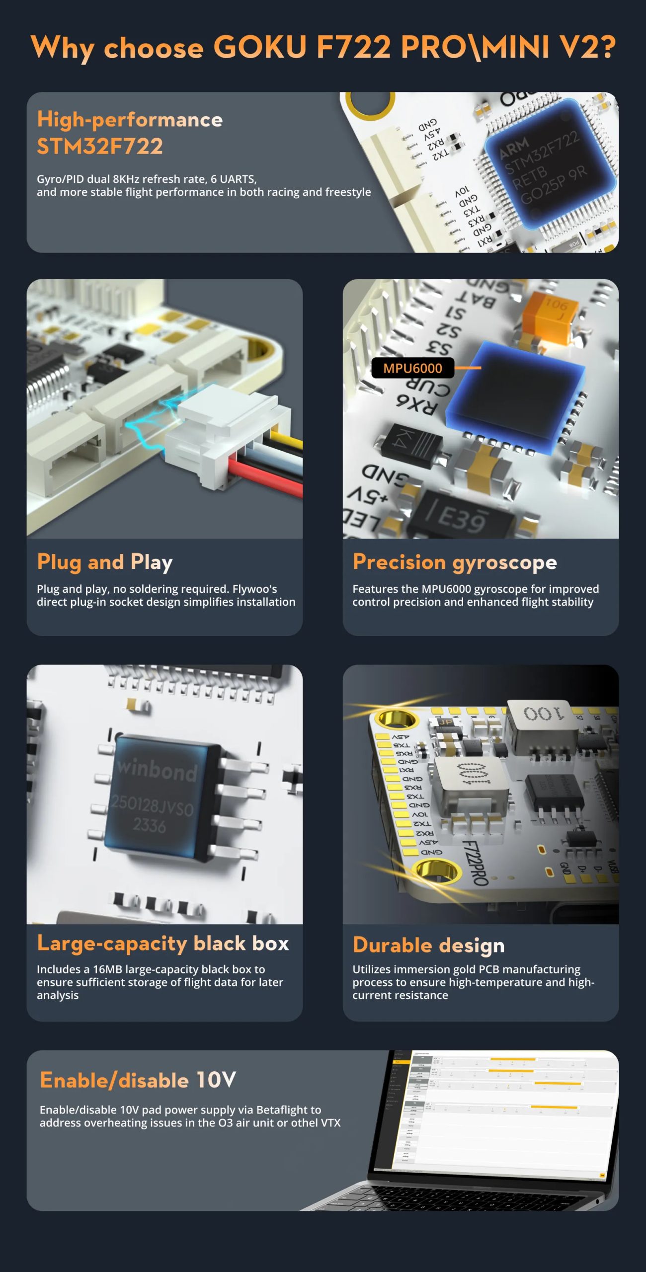 The new generation F722 PRO V2 flight controller from FLYWOO not only offers a standard 30.5mm size, high-performance STM32 F722 main control, and MPU6000 gyroscope, but it also supports 8 motor outputs and reserves dual 4-in-1 ESC sockets.