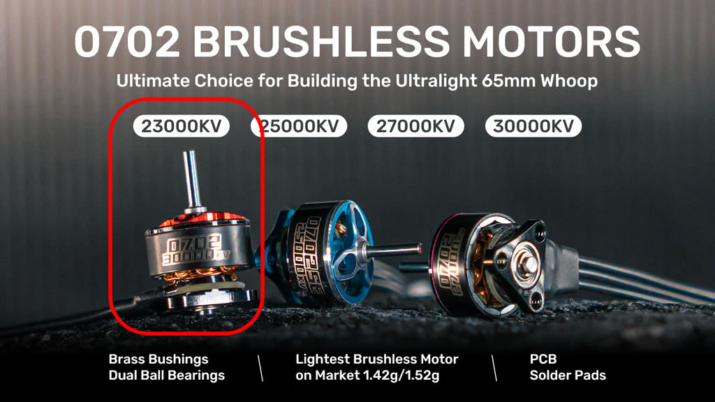 0702 motors between 22,000 and 27,000KV are a great choice for economical flight on 1S whoops.