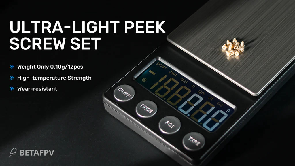 PEEK Screws is the ultimate solution for lightweight whoop, taking more grams off the build. PEEK screws only weigh 0.10 grams/12pcs, it can save up to 0.46 grams for a build that is using metal screws, while still being stronger and more durable than nylon screws. With more heat resistance, anti-friction, anti-shock, and anti-fatigue properties, the PEEK Screws are both reliable and durable. They are perfect for building 65mm/75mm size drones, including the lightweight Meteor series drone.